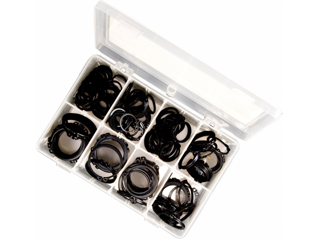 Zestaw zewnętrznych pierścieni zabezpieczających - do wałów DIN 471. Pakowane w plastikowej kasecie z wiekiem, 250 szt. do wałów o średnicach 20, 22, 25, 30, 35, 38, 40, 45 mm.