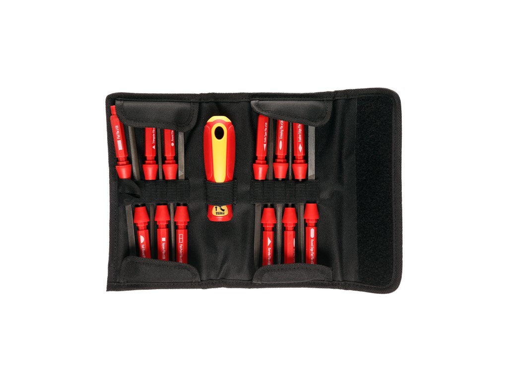 Zestaw 13 szt. klasycznych pilników iglaków o różnych kształtach. Do ich szybkiego mocowania służy rękojeść, która wchodzi w skład zestawu. Materiał pilników wysokostopowa stal węglowa, twardość 60 – 65 HRC. Materiał rękojeści PP/TPR/POM.