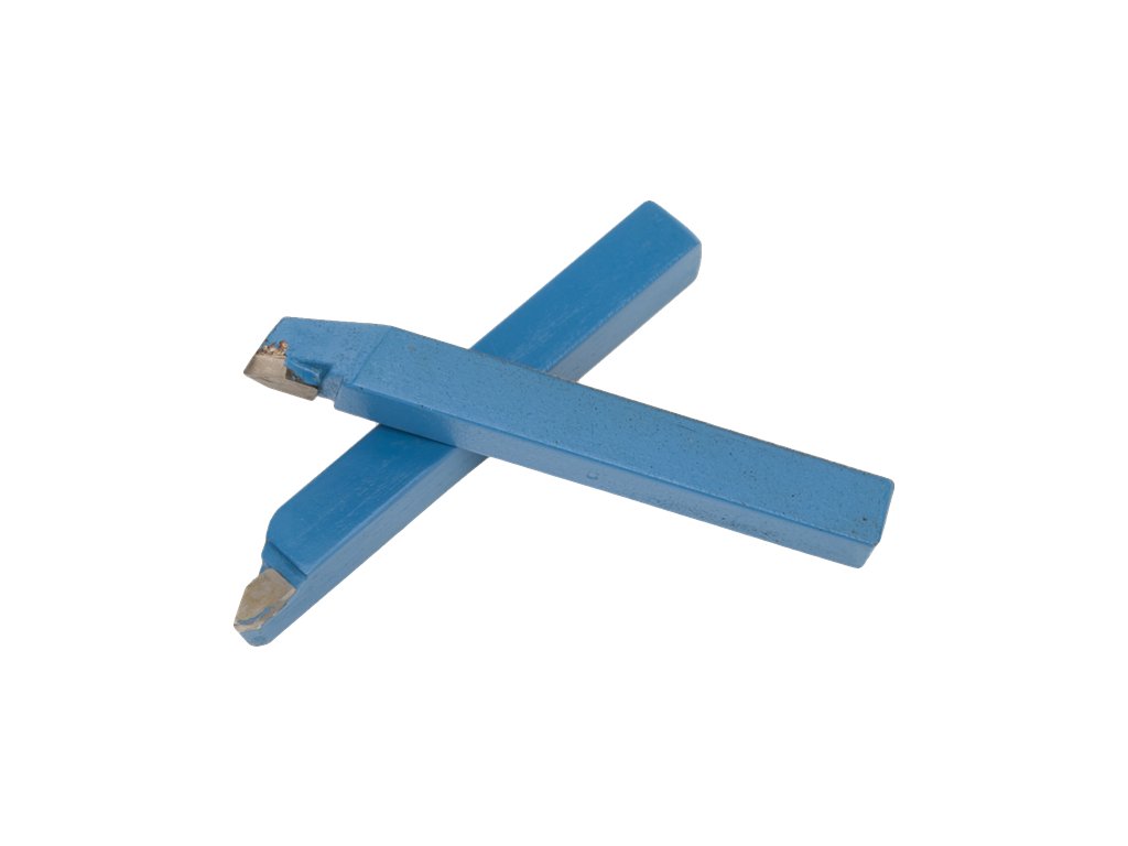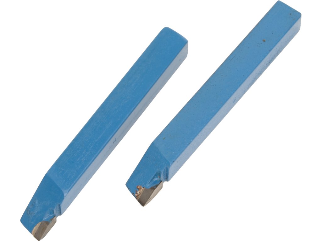Zestaw 2 szt. zewnętrznych noży tokarskich 12 × 12 mm z lutowanymi ostrzami. Szczytowe kąty na nożach 55° i 60°.